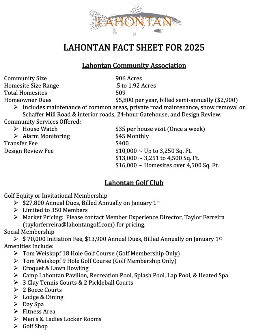 The gated community of Lahontan is maintained by an HOA, which is separate from the Lahontan Golf & Country Club. If you own in Lahontan, your HOA dues pay for the gate house and security, the roads, snow removal and other common area maintenance.