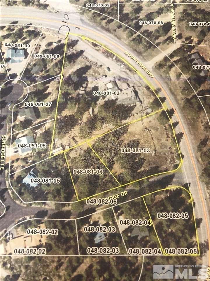This historic location is a redevelopment opportunity! Parcel consists of 4.079 acres of General Commercial zoning. Also includes lot 048-081-04 which is .435 acre. This can be developed as a home site or maintained as a buffer zone. 048-081-02 aKa The Reindeer Lodge site consists of 2.46 acres of General Commercial zoning located on Mount Rose Highway leading to the Mt Rose Ski Resort and Lake Tahoe. Currently, on septic and private/municipal but can be connected to municipal sewer., 048-081-03 aka 10 Sunrdrige Drive is a 1.05 General Commercial zoning lot. 048-082-05 aka 5 Sunridge Drive is a stand alone commercial lot of .56 acre and can be developed separately. 048-081-01 is used to improve access to the Reindeer Lodge site. The existing structure is expected for removal Spring 2020. Mt Rose/Slide Mountain Ski Area is approximate three miles. A RARE OPPORTUNITY WITH SUBSTANTIAL TRAFFIC COUNT BETWEEN RENO AND LAKE TAHOE; ALLOW YOUR DEVELOPERS IMAGINATION SOAR!!!