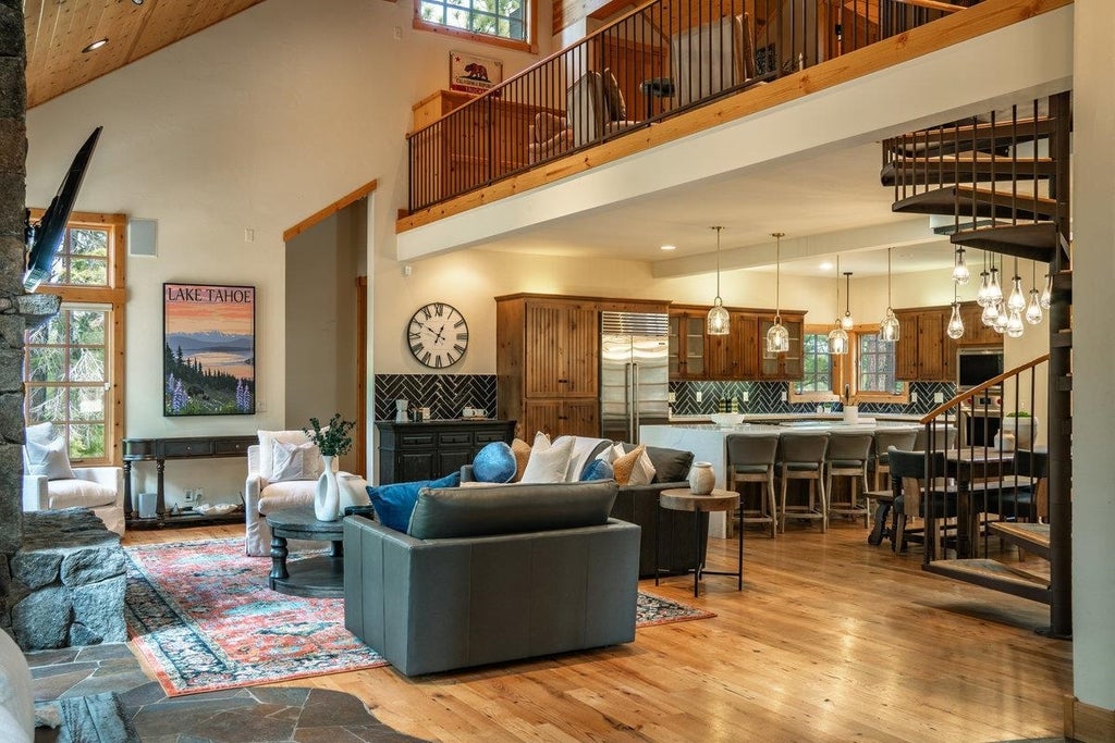 Motivated seller! This stunning Lahontan retreat blends mountain charm with modern luxury. Designed primarily as a single-level home, it offers effortless year-round living in this prestigious golf community. The great room features soaring ceilings, rich wood floors, and expansive windows, with seamless access to a spacious patio complete with an outdoor fireplace, perfect for cozy evenings and family gatherings. The updated chef’s kitchen boasts high-end appliances, an oversized island, upgraded tile and granite, a dedicated coffee station, and imported hand-blown light fixtures. A beautifully curated French country dining space enhances the home’s warmth and character. Just outside, a second sunlit patio provides a peaceful setting for morning coffee. The primary suite offers a luxurious retreat with a gas fireplace, a walk-in closet, and a remodeled en-suite bath featuring a free-standing soaking tub, a walk-in shower, and upgraded lighting. A second suite, located at the opposite end of the living area, provides a private haven with its own fireplace, forest views, and an updated bath with high-end ceramic tile and a walk-in shower. Upstairs, a spiral staircase leads to a versatile loft, ideal for guests or a home office, with its own bath. Additional enhancements include freshly painted bathrooms and bedrooms, a new washer and dryer, new leather furniture in the great room, and new choke cherry and aspen trees. This meticulously maintained home also features an advanced, locally monitored security system and a whole-house water shut-off system. Nestled on a beautifully landscaped 0.63-acre parcel, the property includes a spacious garage with extra storage, a sweeping driveway with ample guest parking, and picturesque surroundings. A quarter cord of dried firewood and kindling ensures the two wood-burning fireplaces are ready for mountain living. Experience the exceptional lifestyle Lahontan offers and discover the warmth and elegance of this mountain retreat.