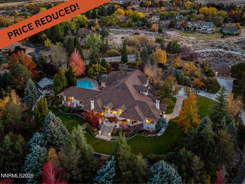 Experience unparalleled luxury and privacy in this extraordinary old south suburban Reno Legacy Estate. Featuring 7,300sf of single level living plus 2,800sf of upstairs space, including a massive game room, kitchenette, full bath, and hobby or exercise room, this gated oasis spans 6.84 acres of meticulous landscape. With 5 en-suite bedrooms (yes, all are on the main floor) including two master bathrooms - one with an attached yoga room - there is plenty of space and privacy for everyone. The main level also features the primary living spaces, a stately wet bar with flawless cherry hardwood flooring, a library with built-ins, a separate study, mudroom, and laundry room. Entertain effortlessly on the back patio surrounding the heated in-ground pool or grow a year-round garden in the 510 sf greenhouse that has electricity, heat, and running water. Additional features include an oversized 3-car garage, a detached 2-car garage with workshop, and covered RV parking. The lush landscaping includes two vineyards, too many mature trees to count, vibrant roses, and colorful shrubs - all irrigated by a private well and 12-acre feet of surface water rights. Modern amenities include a nearly new roof, updated mechanical and pool systems, one-year-old electric CellGate entry, automatic generator, and a discreet solar field that banks credit with NV Energy. Atop a tree-lined drive, this magical estate offers sweeping views of the foliage and serene valley beyond. Minutes from shopping, dining, the airport, and top-rated public and private schools, this rare northern Nevada property is just 45 minutes from the shores of Lake Tahoe and less than an hour from the area's best skiing, hiking, and biking terrain. 2185 Kinney Lane is gorgeous - and ready and waiting for someone new to call it home.