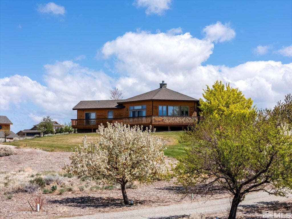 If you're looking for that perfect blend of comfort and style, check out this gorgeous custom home nestled in the heart of Gardnerville, NV. Spanning over 5.36 acres, this corner property boasts a huge workshop and a cozy guest house with an attached garage. The main house is 2,588 SF and has three spacious bedrooms and two full baths. The open floor plan is perfect for entertaining or just kicking back and enjoying life. Custom vaulted beam tongue-and-groove ceilings, expansive windows, and sliding glass, doors flood the space with natural light while offering views of the Sierra Mountains. Now, let's talk about the kitchen with deep pull-out drawers that make accessing your pots and pans a breeze, stunning custom cabinets, solid surface countertops, and a double sink. The owner's suite features vaulted ceilings, more incredible mountain views, and a large walk-in closet with custom built-ins. The adjacent bathroom has a jetted soaking tub, a walk-in shower, and a dual vanity. At the other end of the home, you'll find two more generously sized bedrooms and a full bath, ensuring plenty of space for everyone. There's also a designated office and laundry room equipped with cabinets and a built-in desk. Let's not forget the Workshop/Barn, approximately 1944 sf, three roll-up doors, a 1/2 bath, a loft area for additional storage, and space for RV parking. Finally, the 600 SF guest house has a loft, a 3/4 bath, and an attached garage. The driveway is lined with mature fruit trees like cherry, apple, peach, and plum - perfect for those summer days when you want to grab a fresh snack. The landscaped grounds also include lush lilac bushes just past the fruit trees and around the house. This area is fantastic for walking, biking, or even riding horses. If you've got animals, there's more than enough space for them to roam. You're just a stone's throw away from Tahoe, Reno, Virginia City, Jobs Peak, Genoa, and so much more.
