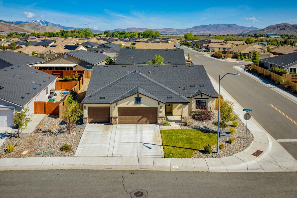This beautiful one-level home, only six years old, is perfectly positioned on a corner lot with gorgeous mountain views from the back and front yards. It features a bright and airy great room with vaulted ceilings, ceiling fan, and a spacious kitchen with a large granite island, stainless steel appliances and newer wood look flooring throughout. The primary bedroom includes a generous walk-in closet and bathroom with dual sinks, garden tub and separate shower. A sliding door leads to the backyard patio. Two additional bedrooms are nearby, while an additional bedroom with full bathroom is situated on the other side of the home. The expansive laundry room is equipped with cabinets, shelves and ample counter space for folding and chores. The back yard, complete with the paver patio and terraced hardscaping, is ready for your finishing touches. The property also includes a nice three-car garage with a south-facing driveway. Nearby amenities include parks, a sports complex, and golf courses. Reno-Tahoe International Airport is 35-40 minutes away and Lake Tahoe is only 15 miles away. Some photos have been digitally staged.