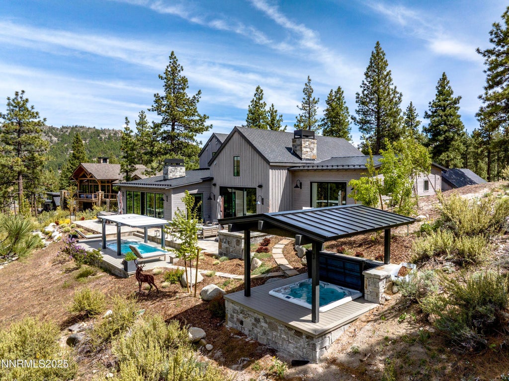 Welcome to Meadow View at Clear Creek Tahoe—a luxurious Modern Farmhouse retreat ideally nestled on 1.25 private acres in one of Nevada's most exclusive gated mountain communities. Overlooking a vibrant wildflower meadow with expansive views, this custom 4,883 sq ft residence offers the perfect blend of refined mountain living and contemporary elegance. Thoughtfully designed for both privacy and entertaining, the open-concept floor plan features four spacious bedroom suites, soaring ceilings in the great room with floor-to-ceiling stone fireplace, a den, billiards room, and a separate game room. Retractable sliding doors seamlessly connect the interior to an outdoor oasis with an infinity-edge swim spa, built-in BBQ, custom firepit, and five separate outdoor entertaining zones. The gourmet kitchen is a chef's dream, highlighted by an imported LaCanche range, quartz neolith silk countertops, a back kitchen with coffee bar, and walk-in pantry. The primary suite boasts sweeping meadow views, a cozy stone fireplace, radiant-heated floors, soaking tub, and dual walk-in closets. Additional features include a detached office with half bath, Sonos sound system, EV charging station, and over 1,150 sq ft of garage space including a dedicated golf cart garage. With unmatched views, ultimate privacy, and luxurious details throughout, Meadow View captures the essence of elevated mountain living at Clear Creek Tahoe. Clear Creek Tahoe is more than a community—it's a lifestyle. Anchored by Nevada's #1 ranked residential golf course, it offers an unparalleled blend of mountain and lake amenities. The private Lake & Ski House provides 180 feet of sandy beach, water sports, and a shuttle service to Heavenly Ski Resort. Summit Camp is a hub for recreation with a pool, water slide, hot tub, tennis, pickleball, and bocce. At the heart of it all, the spacious Clubhouse features a year-round wellness and fitness center, ensuring adventure and relaxation in every season. Social Membership fee 100K