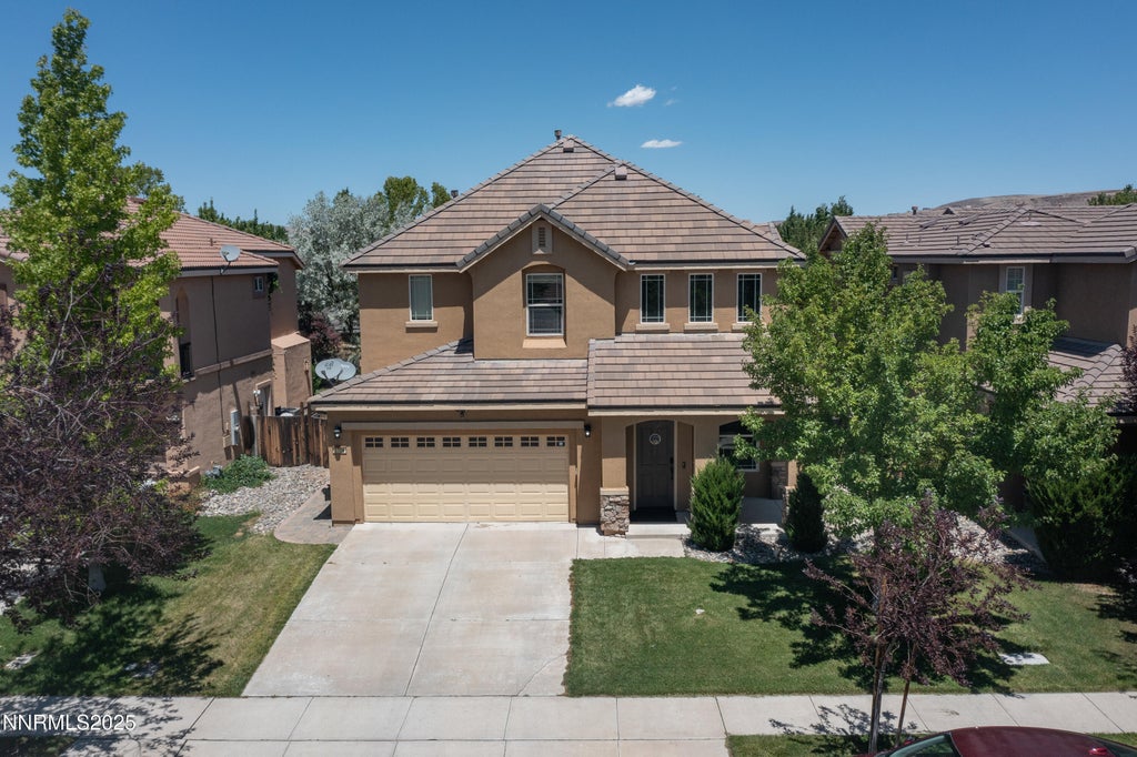 This spacious two-story home offers 2,554 square feet of well-designed living space, featuring 4 bedrooms plus a bonus office/den located on the second floor. Ideally situated near Red Hawk Golf Course, shopping, and scenic trails, this home blends comfort and convenience. The main floor includes both a formal living room and a cozy family room, a formal dining room, and a downstairs bedroom with a full bathroom just steps away—perfect for guests or multigenerational living. The kitchen is a chef's dream with a large pantry, generous counter space, built-in wine refrigerator, and a functional island. Upstairs, the primary suite offers a retreat-like feel with dual sinks, a soaking tub, shower stall, and a spacious walk-in closet. Energy efficiency and modern living are top priorities with Tesla solar panels, an EV charger in the garage, and two Tesla Powerwalls for battery backup that are 100 percent paid for! The beautifully landscaped backyard features a gazebo and backs directly to a walking trail, offering privacy and access to the outdoors. This home has it all—space, location, and sustainability.