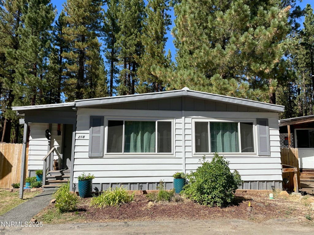 Nestled in the peaceful Ponderosa Park community in lower Kingsbury, this well-maintained 2-bedroom, 2-bath manufactured home offers the perfect blend of mountain charm and convenient access to Lake Tahoe's year-round lifestyle. Located on a level lot at the end of a quiet cul-de-sac, this property offers privacy and serenity, with the backyard backing directly to US Forest Service land. This property includes ownership of the land, providing long-term value. Step inside to 1,248 Sq Ft single-level living, featuring a spacious living room that flows seamlessly into the dining area, perfect for gathering, share meals, and making memories. The kitchen is equipped with a breakfast bar, built-in oven, and gas cooktop. The primary bedroom features an en-suite bath, spacious closet, and serene forest views. A dedicated laundry room with cabinets and shelving adds convenience. The fully fenced backyard, complete with storage shed, offers space for both relaxation and utility. The mud room is a convenient place to store toys such as bikes, paddle boards, skis/snowboards, etc. Grab your bike and ride straight out the back gate onto miles of forest trails, winding all the way to Nevada Beach or Round Hill Pines Beach. By car, Heavenly's Nevada base lodge is just 8 minutes away and Tahoe's beaches within 2 miles. Walk to Kahle Community Center, gym, restaurants, coffee shop, post office, hardware store, and more. Stay comfortable year-round with natural gas heating and evaporative cooling. Recent upgrades include a new natural gas water heater (2025) and a new epoxy coating on the roof (2025). A modest HOA fee of 100/month covers snow removal, keeping winter access worry-free. Whether you're looking for a full-time residence in Nevada, a serene mountain retreat, or an income-producing rental, this home provides affordable access to the Tahoe lifestyle you've been waiting for, while enjoying Nevada's favorable tax benefits and low property taxes. Experience the best of Lake Tahoe living and schedule your private showing today.