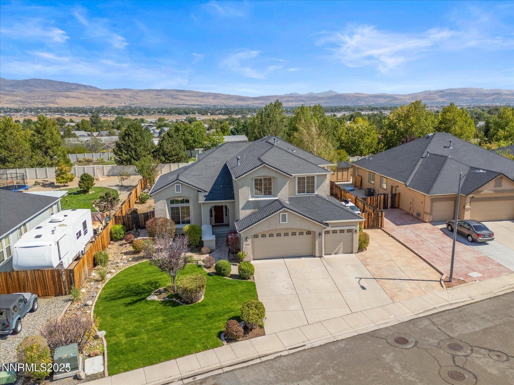 Welcome to this spacious 3,274 sq ft home, thoughtfully upgraded by the original owners and set on a large, private lot with space for entertaining, no rear neighbors and mountain views. The property offers exceptional outdoor living with over 43 yards of stamped concrete, RV parking, a large storage shed, a beautifully landscaped front yard, and a backyard designed for both beauty and flexibility. Enjoy mature roses and plants, along with fruit trees including apricot, peach, plum, and cherry. An area has been prepped with soil for a lawn or a future buyer's vision, while the concrete patio and walking paths, plus a gas stub for BBQ, make entertaining easy. Inside, the home features travertine tile and laminate flooring throughout. The open kitchen is highlighted by granite countertops and backsplash, extended cabinetry, and a convenient wet bar with wine fridge. A full bedroom and bathroom on the main level provide flexibility for guests or multigenerational living. Upstairs, you'll find four additional bedrooms plus a loft with a built-in desk and office cabinetry. The primary suite is truly special, with a large attached bonus room- perfect for an office, fitness space, or custom walk-in closet- and a spa-like bathroom with a deep jetted tub. Additional highlights include zoned heating and cooling, abundant storage, surround sound speakers, and a 3-car garage with an extra 6 feet of depth for oversized vehicles, toys, or storage. Thoughtful details such as elegant arches and interior switch-controlled exterior holiday lighting, along with numerous upgrades throughout, make this home both unique and inviting. This is the perfect blend of space, style, and function... don't miss your chance to own it!